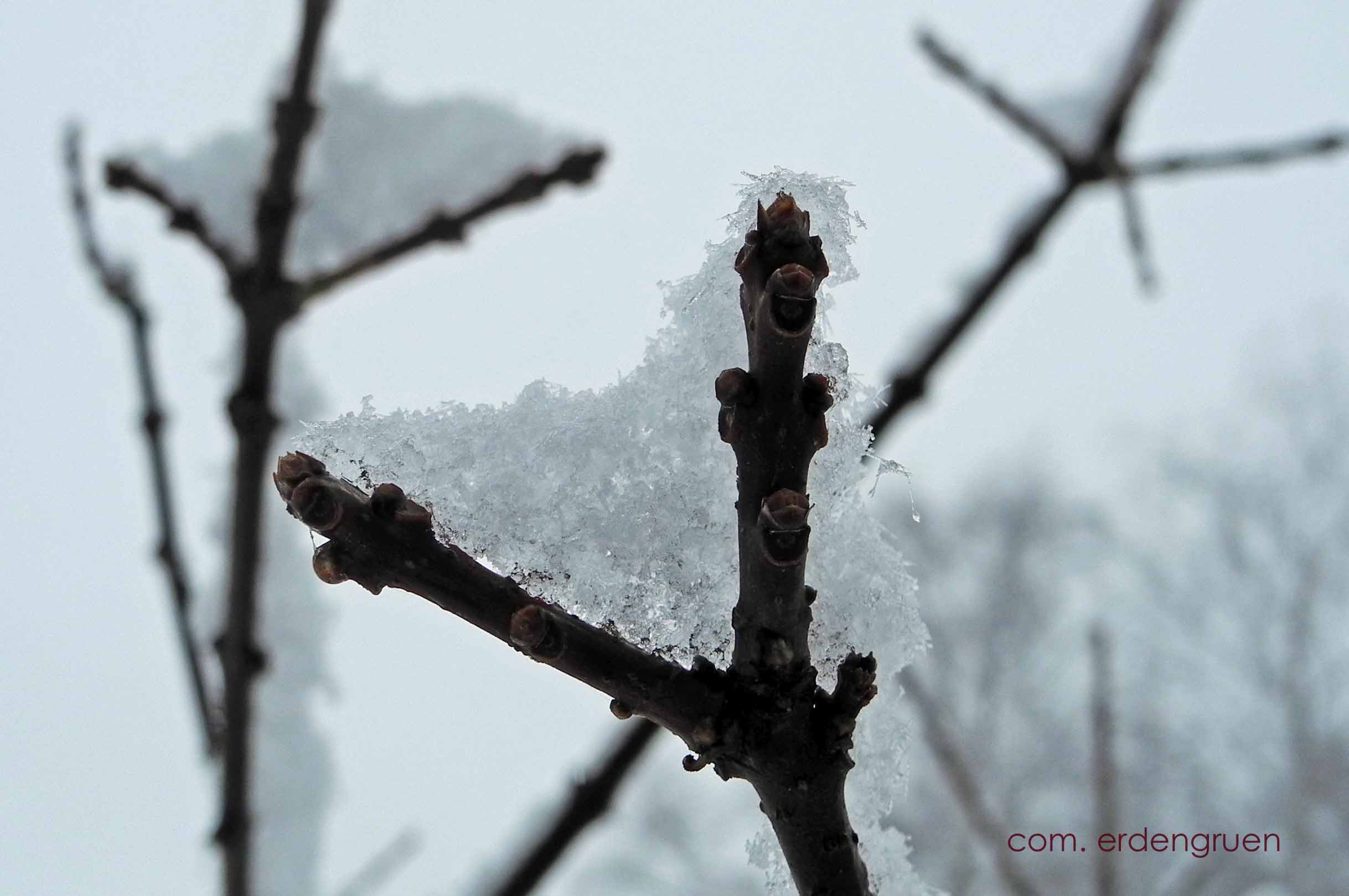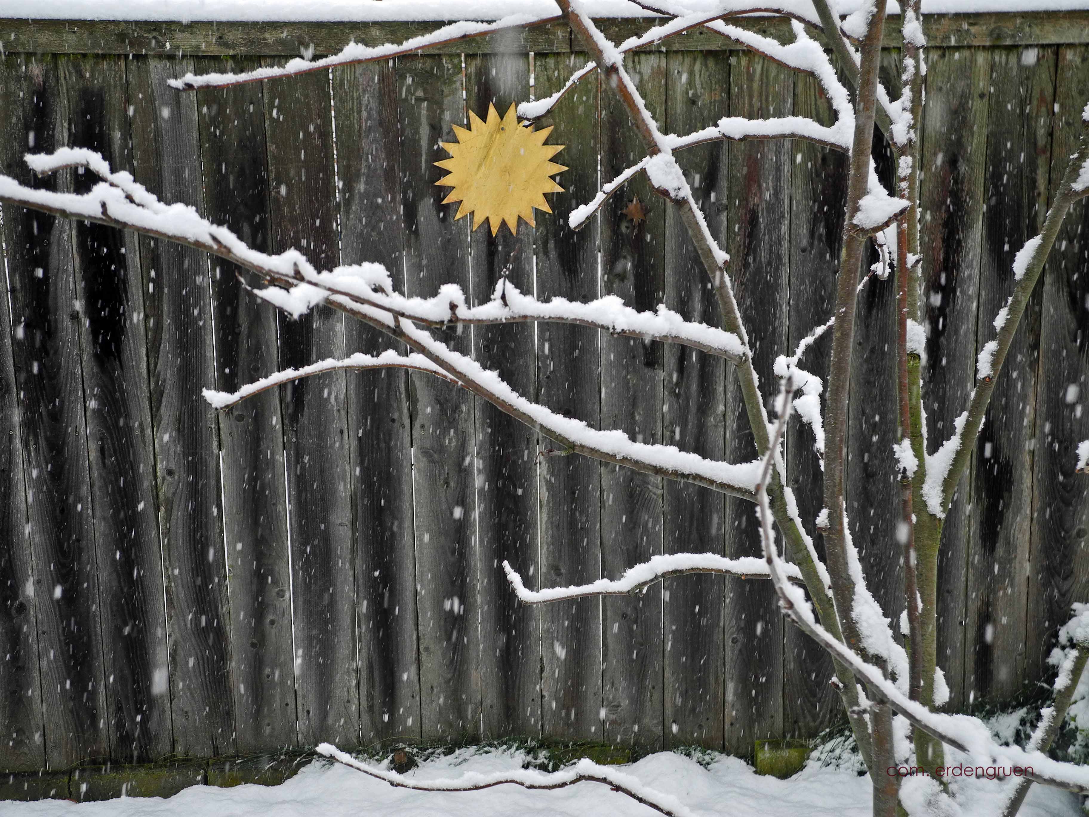 Der Garten färbt sich weiß. Lautlos. Nicht nur, dass die Flocken ohne jedes Geräusch vom Himmel fallen, sie überziehen auch die Erde mit Stille. Jetzt bange ich doch ein wenig um den Schneeflockenbaum, der den ersten Winter bei uns erlebt. Ob ihn die kleinen Eiskristalldreiecke, die sich in seinen Zweiggabeln zusammen tun, daran erinnern, dass er trotz seines Namens im Sommer seine beste Zeit hat?