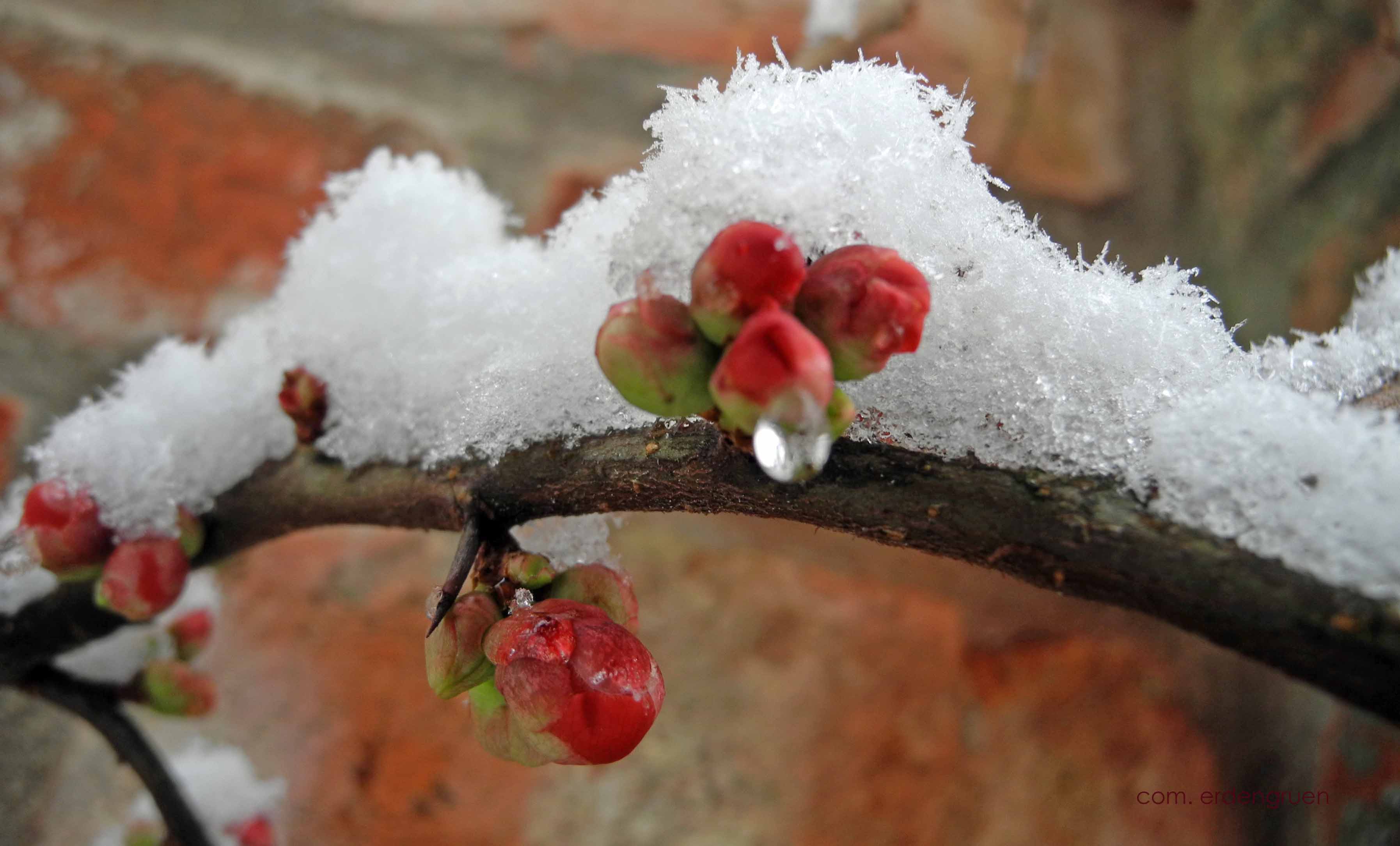 Am liebsten würde ich allen Knospen eine Mütze aufsetzen. Die kleinen knallroten Blüten der japanischen Zierquitte vor der Mauer leuchten dem Schnee entgegen, als könne sie nichts in der Welt aufhalten. Sie sind die ersten Blüten in unserem Garten.