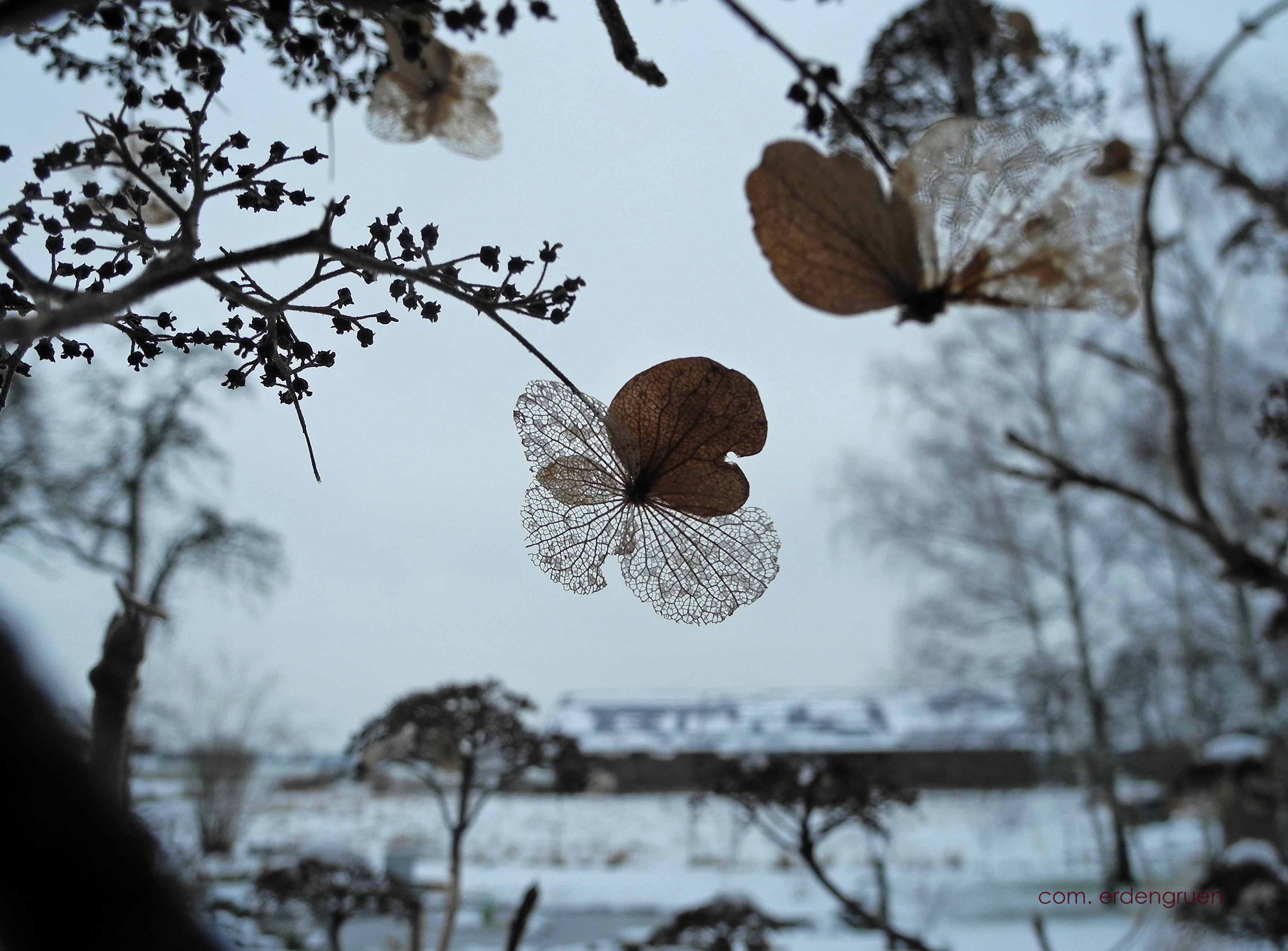 Die kleinen Randblüten der Samthortensie sitzen mit ihren transparenten Blütengebilden wie Falter an den zerbrechlichen Stielen und bewegen sich im Luftzug der zarten Schneewinde. Wie kann etwas so zerbrechlich Scheinendes diesen eisigen Temperaturen trotzen? Und wie kann etwas in seiner Vergänglichkeit so zauberhaft schön sein?